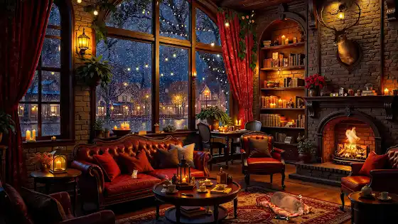 🌧️On a rainy night, in a small corner of a quiet café, the dim light from candles softly illuminates the old brick walls. The large window opens to the outside, where raindrops fall gently on the street, reflecting the soft glow of streetlights. Golden leaves drift from the trees along the street, creating a romantic and tranquil atmosphere. Sitting at a small coffee table, steaming cups of tea exhale gentle wisps of smoke, while the soft sound of piano music fills the air, adding warmth to the space. Books are neatly arranged on the shelves, and an antique armchair in the corner beckons to those seeking to enjoy the peaceful setting.
