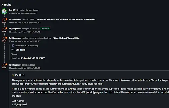 hashtag#BugBounty hashtag#EthicalHacking hashtag#InfoSec hashtag#OpenRedirect hashtag#DuplicateBug hashtag#Cybersecurity hashtag#InfosecJourney hashtag#HackWithRohit