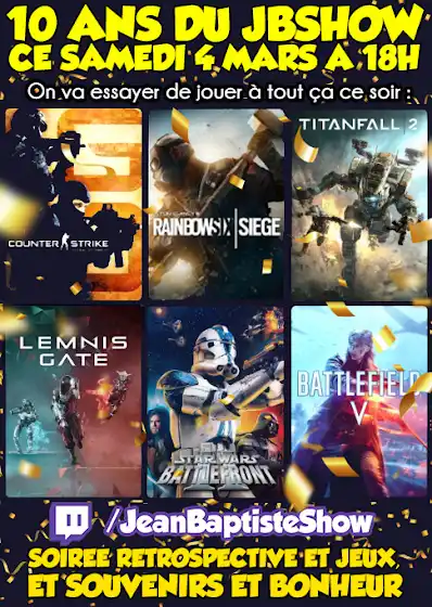 Salut les Jean! Ce soir à 00h00 c'est les 10 ans de la chaine youtube! On partage nos souvenir et on ira jouer aussi, hésitez pas à venir faire un petit coucou ici : www.twitch.tv/jeanbaptisteshow