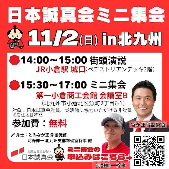 明日11月2日(日)に、北九州で街宣&ミニ集会を開催します【街頭演説】・14:00〜15:00・JR小倉駅 城口(ペデストリアンデッキ2階)・弁士:冨永正博 副党首、河野伸一 幹事 ほか【ミニ集会】・ 15:30〜17:00・ 第一小倉商工会館 会議室B(北九州市小倉北区魚町2丁目6-1)・ 参加費:無料【参加申込みフォーム】forms.gle/RYi3vCSoyxcejN1A8お気軽にご参加お申込みください!