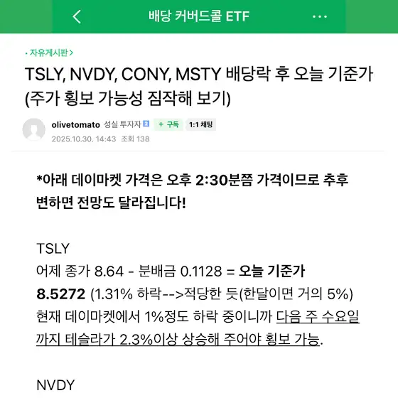 CONY, MSTY의 분배금은 너무 높고 본주 상승이 잘 나오지 않고 있어서 ETF 주가 회복도 쉽지 않은 상황입니다.저의 경우 배당락 후에 주가 회복 가능성을 보면서 평단을 관리하려고 노력 중입니다.카페에서 전문보기 : cafe.naver.com/dividendking/1959