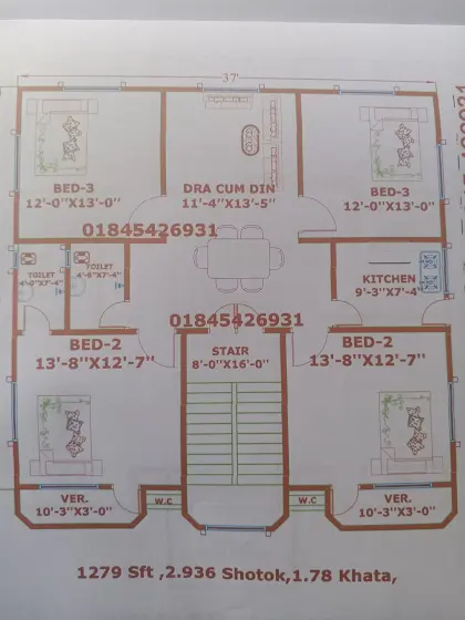 ৪ রুমের একতলা বাড়ির ফুলোর প্লান