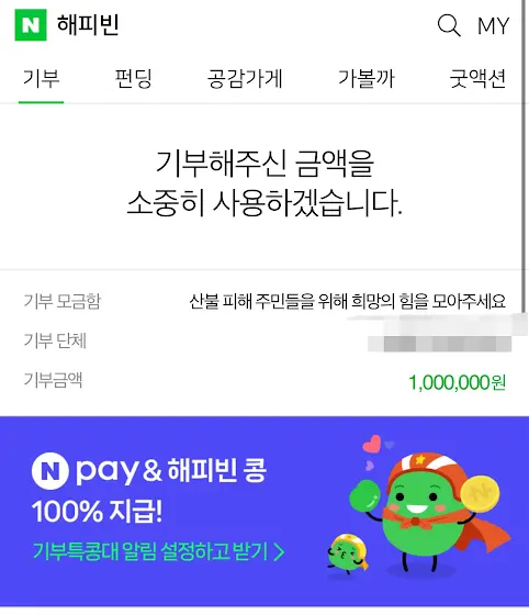 안녕하세요 피치림입니다. 최근 전국적인 대형 산불로 인하여 많은 산림과 재산피해와 인명피해를 입고 있습니다.. 자연에서 즐기는 컨텐츠를 만드는 사람으로써 현재의 상황이 마음 아플 뿐입니다.. 특히 산불 현장과 제가 사는 곳이 멀지 않은 곳이라 마음이 더 무겁습니다,, 더 이상 피해가 없기를 바라며 작은 도움이라도 되었으면 좋겠습니다🙏🏻