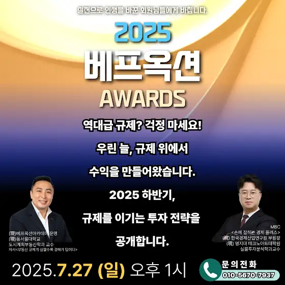 참가 신청서 : forms.gle/itX8QKKY9snGcJVY9 [2025 베프옥션 어워즈] 🏆 실전으로 인생을 바꾼 수강생들의 명예로운 시상식! 💡 그리고 박정호 교수님 & 이성재 멘토님의 특별 세미나까지! 수강생 여러분 모두를 초대합니다. 소중한 자리를 함께해 주세요. 📢[놓치면 후회할 리마인드 안내] 한 번 들었다고 끝이 아닙니다. 한 번의 자극으로는 인생이 바뀌지 않죠. 하지만 우리, 이렇게 다시 으쌰으쌰하며 실전에서 또 한 걸음, 나아가고 있습니다. 이번 자리에선 이런 이야기를 나눕니다: 1️⃣낙찰 노하우 경쟁을 뚫고 물건을 내 것으로 만드는, 그 실제 전략과 사례 2️⃣ 수익률 극대화 비법 단순한 낙찰이 아니라 ‘어떻게 수익을 뽑아내느냐’의 핵심 노하우 3️⃣ 10회 이상 낙찰 및 수익 실현자들의 이야기 ‘명예의 전당’ 시상식 – 실전에서 증명한 선배들의 살아있는 스토리 혹시 지난 수업이 아쉬웠던 분들, 시간이 안 맞아 놓쳤던 분들, 그때의 마음을 다시 꺼내보고 싶은 분들께 이 자리를 권합니다. 📅 일시 : 2025년 7월 27일(일) 오후 1시 📍 장소 : 추후 안내 💵 참가비 : 1만원 (1005-504-022315 우리은행 예금주 : 베프옥션 아카데미) 📞 문의 010-5670-7937 ▼▼▼▼▼▼▼▼▼▼▼▼▼▼▼▼▼▼▼▼▼▼▼ 참가 신청서 : forms.gle/itX8QKKY9snGcJVY9 ※ 신청 마감은 7월 12일 (토)까지 입니다. -추가 공지사항- “당신의 여정을 모두가 박수칠 시간입니다.” 다가구 2채 이상, 빌라·오피스텔·아파트 10채 이상, 또는 토지·공장·창고 2건 이상을 경매 또는 일반 거래로 직접 매입하신 분 중, 경제적 자유를 실현하신 분들의 이야기를 찾습니다. 저희와 함께 경험을 나눠주신 분께는 시상식에서 ‘명패’와 ‘순금 미니 골드바’를 수여합니다. 문의는 010-5670-7937로 연락 부탁드립니다