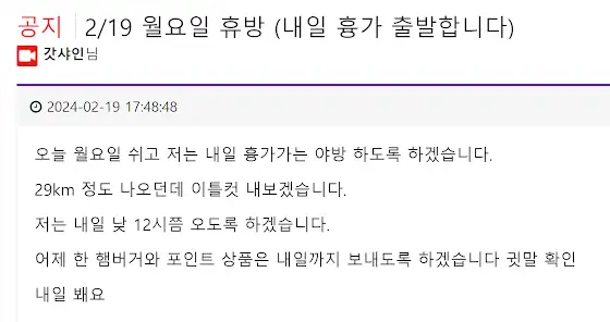 🚨 공지🚨 2/19 월요일 휴방 (내일 흉가 출발합니다) ------------------------------------------------- 오늘 월요일 쉬고 저는 내일 흉가 가는 야방 하도록 하겠습니다. 29km 정도 나오던데 이틀컷 내보겠습니다.- 저는 내일 낮 12시쯤 오도록 하겠습니다.-어제 한 햄버거와 포인트 상품은 내일까지 보내도록 하겠습니다. 귓말 확인내일 봬요