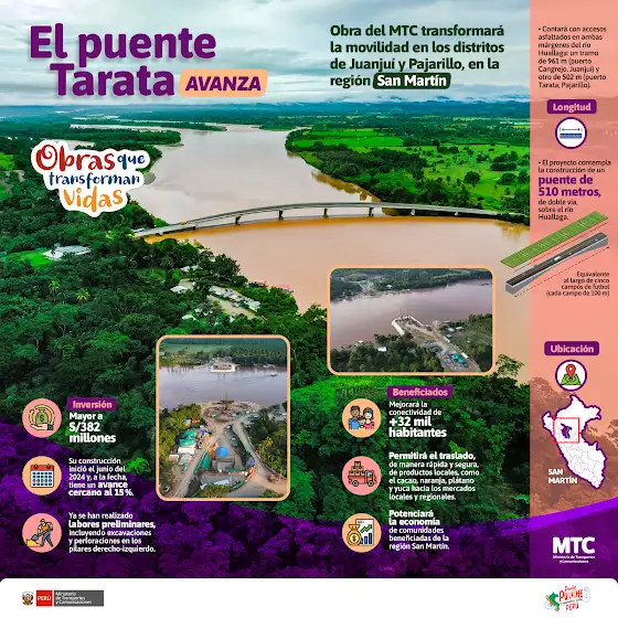 ¡El puente Tarata en #SanMartín avanza! 🌉 ✅ Esta infraestructura será una conexión clave entre los distritos de Juanjuí y Pajarillo, facilitando el transporte de productos agrícolas como cacao, naranja, plátano y yuca hacia los mercados locales y regionales.