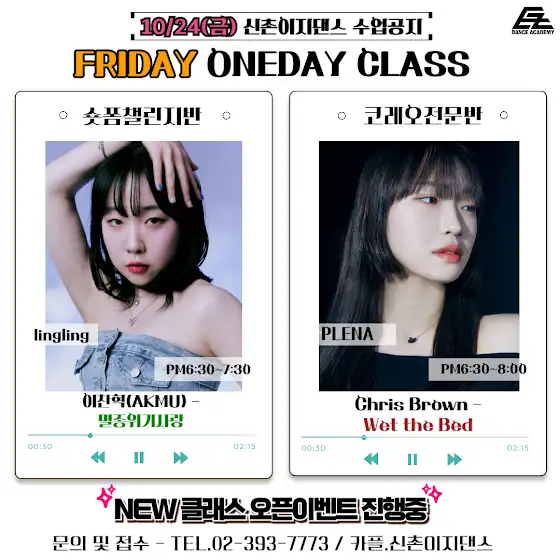 ✨25년 10월 24일 금요일에 진행되는 원데이 클래스 곡명✨ 숏폼챌린지반 & 코레오전문반 원데이클래스 곡명을 공개 합니다! 💫 10월 24일 금요일 PM 6:30~7:30 🌿숏폼챌린지반 🌿 은 Lingling 쌤의 #이찬혁 ( #AKMU ) - #멸종위기사랑 #챌린지 안무가 진행됩니다 -!! 10월 24일 금요일 PM 6:30~8:00 🚨코레오전문반🚨 은 Plena 쌤의 #chrisbrown ( #크리스브라운 )- #wetthebed #코레오 수업이 진행됩니다 -!! 접수 원하시는 분들은 TEL. 02-393-7773 또는 카카오톡 플러스 친구 #신촌이지댄스 로 문의주세요 🙂 🔮할로윈 이벤트 진행중-!! 선착순으로 마감?!!🔮 🌼10월 18일 #루키즈반 오픈-!🌼 사전 신청 시 두근두근 반값 혜택까지?!! 신촌 : Tel.02-393-7773 / kakao. ezdance114 Blog : blog.naver.com/sinchonez Youtube : youtube.com/ezdance Facebook : www.facebook.com/EZdance.SA/ #홍대댄스학원 #이대댄스학원 #신촌댄스학원 #마포댄스학원 #이지댄스신촌점 #dance #choreo #kpop #challenge #dancecover #choreography #챌린지안무