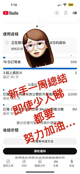 7月7日至7月13日,一周總結,發了六個影片,訂閱人數只有+3。雖然有用心剪片,嘗試優化關鍵詞,整理清單,但經驗不足,未找到利基點及竅門,要堅持每天繼續做片,the best is yet to come。 #smalleryoutuber #堅持Btw..賬號只是500人同3M就可以開live功能? 小號就要1000人同4M,是不是在救濟我? 多謝!