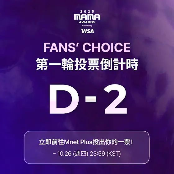 [#2025MAMA] FANS’ CHOICE 1차 투표 마감 D-2⏰ 아직 늦지 않았어요! 지금 바로 내 아티스트에게 투표하세요! 👉mnetplus.onelink.me/TRa8/im1icn0m 🏆 FANS’ CHOICE 1차 투표 기간 ~ 2025년 10월 26일 23:59 (KST) ※ 투표 기간 중 1개의 Mnet Plus ID를 이용해 1일 1회 투표 가능하며, 매일 00:00 (KST)부터 다시 투표할 수 있습니다. -FANS’ CHOICE 1st VOTE Closing D-2⏰ It’s not too late! Vote for your artist now! 👉mnetplus.onelink.me/TRa8/im1icn0m 🏆 FANS’ CHOICE 1st VOTE Period ~ October 26, 2025, 23:59 (KST) ※ You can vote once per day with one Mnet Plus ID during the voting period. Voting resets daily at 00:00 (KST). -FANS’ CHOICE 第1次投票 締切 D-2📢 まだ間に合います!今すぐ推しに投票しよう!👉mnetplus.onelink.me/TRa8/im1icn0m 🏆 FANS’ CHOICE 第1次投票 期間 ~ 2025年10月26日 23:59(KST) ※ 投票期間中、1つのMnet Plus IDにつき1日1回のみ投票可能であり、毎日00:00(KST)から再投票できます。 -FANS’ CHOICE 第一轮投票截止 D-2📢 还不晚!马上为你喜爱的艺人投票吧! 👉mnetplus.onelink.me/TRa8/im1icn0m 🏆 FANS’ CHOICE第一轮投票期间 ~ 2025年 10月 26日 23:59 (KST) ※ 投票期间,每个 Mnet Plus 账号每天可参与 1 次投票,且自每日 00:00(KST)起可重新投票。 -FANS’ CHOICE 第一輪投票截止 D-2📢 還不晚!馬上為你喜愛的藝人投票吧! 👉mnetplus.onelink.me/TRa8/im1icn0m 🏆 FANS’ CHOICE第一輪投票期間 ~ 2025年 10月 26日 23:59 (KST) ※ 投票期間,每個 Mnet Plus 賬號每天可參與 1 次投票,且自每日 00:00(KST)起可重新投票。 #엠넷플러스 #MnetPlus #MAMAAWARDS #2025MAMAAWARDS