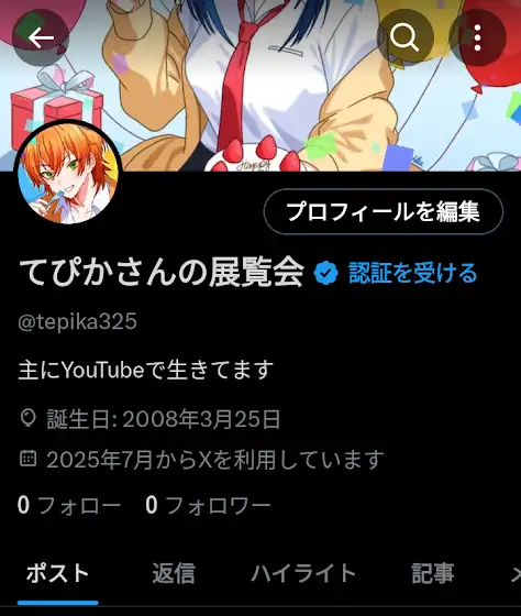 x.com/tepika325?t=lfoNtbv_8KFzoo5NxsYiJg&s=09Twitter(X)の公開垢作ったのでフォローしてくださいたぶんフォロバします(一応チャンネル概要欄にリンク貼ってます)