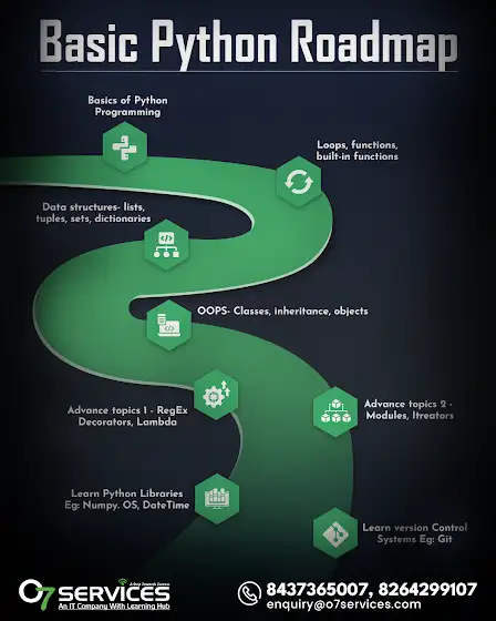Unlock the Python Path with O7 Services! Start with Python fundamentals, then move on to data structures, functions, and advanced topics like OOP and libraries. Get started on your coding journey with us today! 💻🚀