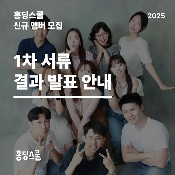 안녕하세요, 흥딩스쿨입니다!이번 2025 신규 멤버 모집에 관심 가져주시고, 지원해주심에 감사드립니다.지원해주신 모든 분들께는 입력해주신 메일로 결과를 발송해드렸습니다.문의사항이 있으신 경우, 아래 흥딩스쿨 메일로 문의해주세요.감사합니다!💌 heungdingschool@gmail.com