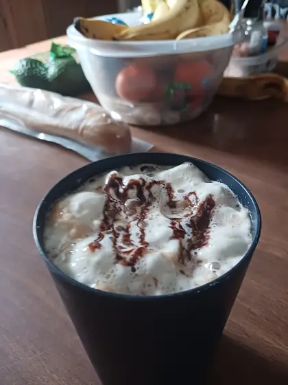 Hot chocolate with a roasted marshmallow and crushed peppermint candy with milk. My specialty to those in the cold to stay warm and toasty