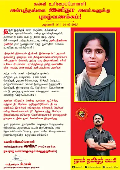 அன்புத்தங்கை அனிதாவின் ஈகத்தைப் போற்றுகின்ற இந்நாளில், அவருடைய உடன் பிறந்தாராகிய நாம் தொடர்ச்சியாகப் போராடி, அவர் கண்ட பெருங்கனவை நிறைவேற்றுகின்ற உறுதியை ஏற்போம்!