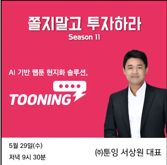 "AI 기반 웹툰 현지화 솔루션, 툰잉"🚀 5월 29일(수) 9시 30분 라이브 - 툰잉 서상원 대표님 🚀안녕하세요, 🚀쫄지말고 투자하라🚀 구독자 여러분, AI를 기반으로 웹툰의 수출을 위한 현지화 프로세스를 효율화하는 솔루션,툰잉을 운영하는 서상원 대표님을 모셨습니다. 금주 수요일 (5월 29일) 오후 9시 30분, 쫄투 채널을 통해 서상원 대표님과쫄투 패널분들의 패널토크를 라이브로 함께 하실 수 있습니다.많은 관심과 참여 부탁드립니다. 쫄투 서포터 올림