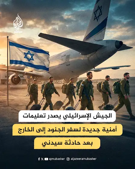 قالت القناة 14 الإسرائيلية إن شعبة العمليات في الجيش الإسرائيلي نشرت تعليمات أمنية جديدة للجنود الموجودين خارج إسرائيل سواء في إطار مهمة رسمية أو خارج الخدمة، وذلك في أعقاب الحادثة التي وقعت هذا الأسبوع في مدينة سيدني الأسترالية.