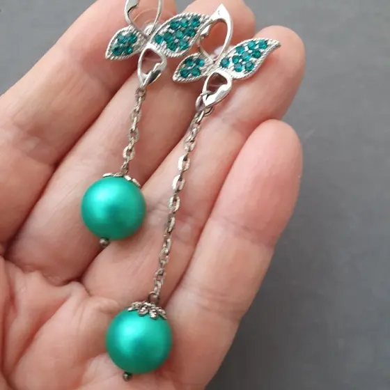 РАСПРОДАЖА предновогодняя!!! Серьги асимметричные. Длинная серьга 6.5 см., короткая серьга 4.5 см. Майорка изумрудного цвета 10 мм.