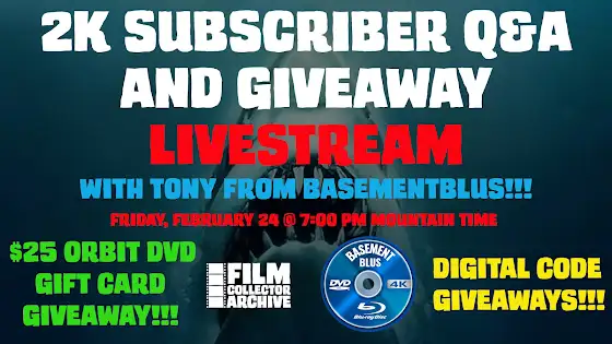 ***LIVESTREAM*** Join @basementblus and Film Collector Archive as we celebrate 2K Subscribers on the YouTube Channel! We will be giving away the $25.00 @orbitdvd Gift Card as promised, as well as some digital movie codes!!! We go live FRIDAY, FEBRUARY 24 @ 7:00 PM MOUNTAIN TIME!!! See ya there!!! 😃🎥🎞#unboxing #unboxingvideo #boutiquelabel #boutiquebluray #bluray #4kbluray #4kultrahd #film #movies #filmcollection #moviecollection #filmcollector #moviecollector #physicalmedia #physicalmediaforever #youtube #giveaway #giftcardgiveaway #orbitdvd #giftcards