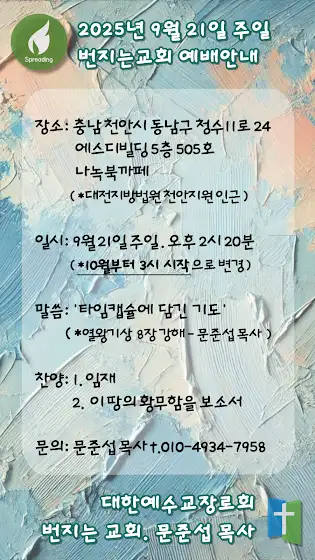 2025.09.21.주일. 번지는 교회 예배 안내 #천안 #교회 #번지는교회 #문준섭목사 #청당동 #청수동 #열왕기상 #8장강해