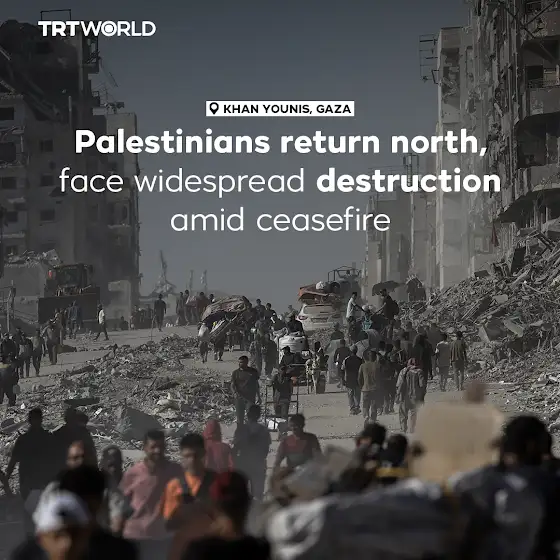 Thousands of Palestinians continued returning to the Sheikh Radwan neighbourhood in Khan Younis, Gaza, on the second day of the ceasefire on October 11, following the withdrawal of Israeli forces. They were met with scenes of widespread destruction and devastation, as families walked through the rubble of their homes and neighbourhoods left in ruin by the occupation.