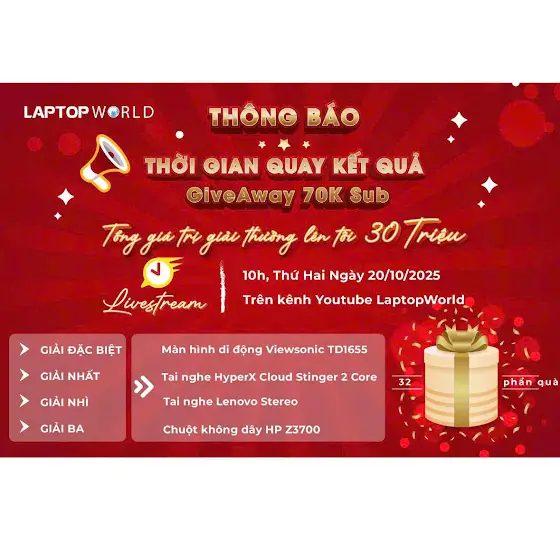 13h00 ngày 17/10/2025 kênh YouTube LaptopWorld đã chính thức đạt mốc 70k Subscriber, nhưng chương trình GiveAway 70k Sub vẫn đang mở cho anh em đăng ký đến hết ngày hôm nay (17/10/2025), những anh em chưa tham gia có thể tham gia ngay trước khi link đăng ký đóng lại. Ngày mai 18/10/2025 chúng mình sẽ tổng hợp lại danh sách người chơi và chuẩn bị cho buổi livestream quay số công bố người chơi may mắn nhất. 10h sáng ngày 20/10/2025 chúng mình sẽ livestream và quay số trực tiếp trên kênh Youtube LaptopWorld. Chúc anh em may mắn! Cảm ơn tình cảm của anh em rất nhiều! ❤️