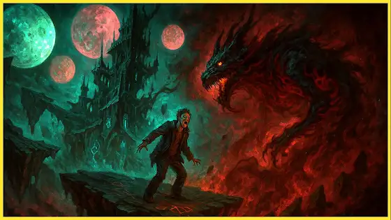 A terrified human figure stands on the brink of a floating island, surrounded by swirling, multi-colored moons and a looming, decaying castle that twists impossibly into the sky. A monstrous, shape-shifting beast writhes nearby, its form flickering between dragon, animal, and shadow, while the air glows with unnatural aqua light and the ground dissolves into a void of swirling cosmic mist. The scene is drenched in oppressive darkness, with jagged, illogical architecture, glowing sigils etched into the stone, and the human’s face contorted in horror and confusion—suggesting the presence of vast, unknowable entities lurking just beyond perception.