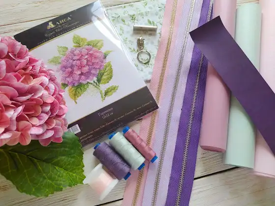 Я приступила к съёмке мастер-класса по мини-холдеру на молнии!😊 Для обложки будущего изделия я выбрала нежную вышивку гортензии, и отталкиваясь от её цветовой гаммы, подобрала материалы.