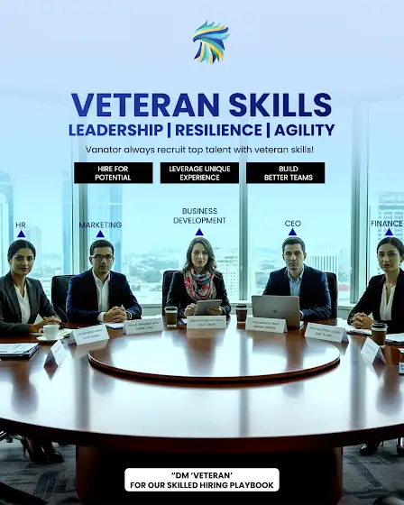 #VanatorRPO #VeteranSkills #Leadership #Resilience #Agility #Vanator #VeteranHiring #TopTalent #BusinessDevelopment #RecruitmentStrategy #TeamBuilding #WorkforceDevelopment #MilitaryToCorporate #VeteranLeaders #HireVeterans #VanatorHiring #VeteranExperience #CorporateGrowth #LeadershipDevelopment #HireForPotential #BuildBetterTeams #GlobalRecruitment #HRStrategy #TalentAcquisition #VeteranWorkforce #DiversityAndInclusion #VeteranRecruitment #VanatorGlobal