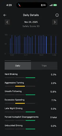 My safety score often DROPS while using FSD, thus increasing my premium.