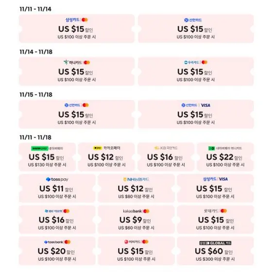 11월 11일-14일: 삼성 Mastercard, 신한 Credit Card
