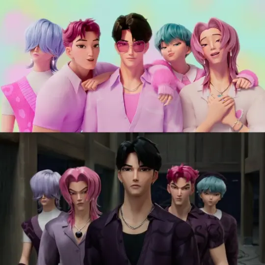 What I love about the second picture is that the Saja boys show their markings on their shirts, indicating they aren't hiding anymore, and then later they perform a song in their actual demon forms