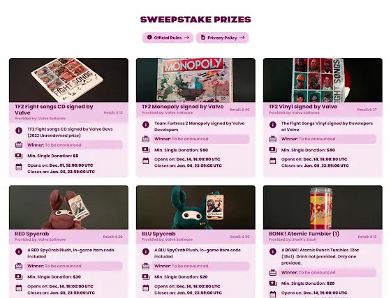 Do you like rare TF2 stuff?... Well Now you have the chance to win:- BONK tumbler! - VALVE SIGNED Fight Songs CD!- RED & BLU Spycrabs!- Bullet Signed by Gary Schwartz!- VALVE SIGNED TF2 Monopoly!You can win these & much more soon at tfconnect.org/prizes 🎁(No donation necessary for a chance to win. When new prizes are announced, if you have already donated the qualifying amount you will automatically be eligible to win)