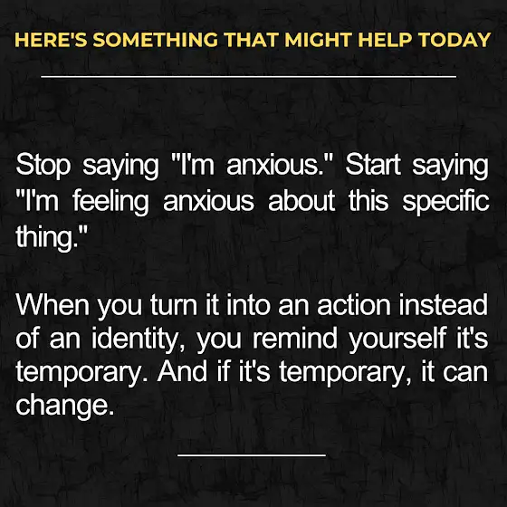 If you want relief, practice separating your identity from your emotions. You are not your anxiety. You are someone experiencing a tough moment. And it will pass.