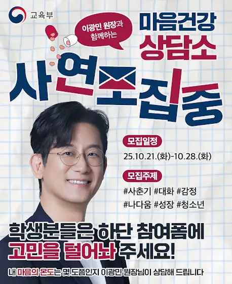 ❤️ 마음건강 상담소 사연 모집요즘 나만 유난히 예민한 것 같고,사소한 일에도 마음이 자꾸 흔들리나요?친구와의 거리, 부모님과의 대화,그리고 미래에 대한 막연함까지.‘왜 나만 이렇게 불행한 걸까?’‘이 혼란스러운 시기에도진짜 나를 찾을 수 있을까?’그 답을 함께 찾아가는 시간,이광민 원장과 함께하는 마음건강 상담소에서여러분의 이야기를 기다립니다.💥 참여 링크forms.gle/vKCHEMjs7oBEA7eR8🌟 모집 일정25.10.21.(화) ~ 25.10.28.(화)🌟 모집 주제#사춘기 #대화 #감정 #나다움 #성장 #청소년