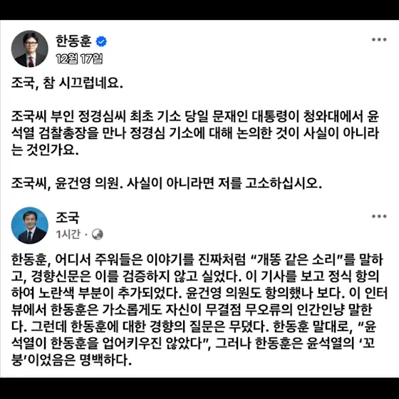 시끄러운 조국은 문재인이 자기 부인 정경심 기소 논의한게 아니라면 고소하라는 한동훈! ㅋㅋㅋ