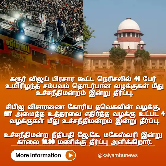 கரூர் சம்பவம் - காலை 10.30 மணிக்கு தீர்ப்பு.#vijay #tvkvijay #tvk #karur #supremecourt #viralpost #viralphotochallenge #kaiyambunews @kaiyambunews