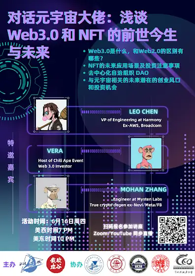 元宇宙和 Web 3.0 是当下的流量话题,一场覆盖科技互联网、区块链等多领域的转型。人们畅想下一代互联网的样子,畅想那个没有垄断、多重宇宙,去中心化之下的世界,一个全新的全球数字经济。而你是否了解元宇宙和Web3.0的真正含义?Blockchain, DAO, NFT, Defi又与他们有怎样千丝万缕的联系?以及有哪些具体的应用场景和案例?而我们又该如何把握未来潜在的创业风口和投资机会?未来的数字世界我们又会有怎样不同的角色转型?职挂云帆栏目组,首次以Web 3.0为主题,邀请到来自业内Harmony DAO的leaders和首席工程师。为你揭开Web 3.0和区块链神秘的面纱,和你聊一聊未来数字世界的蓝图和机遇!活动时间:6月16日周四 美西时间7pm/美东时间10pmZoom Youtube同步直播 与你不见不散!活动报名链接:zgzg.link/zgyf-s4-eps2