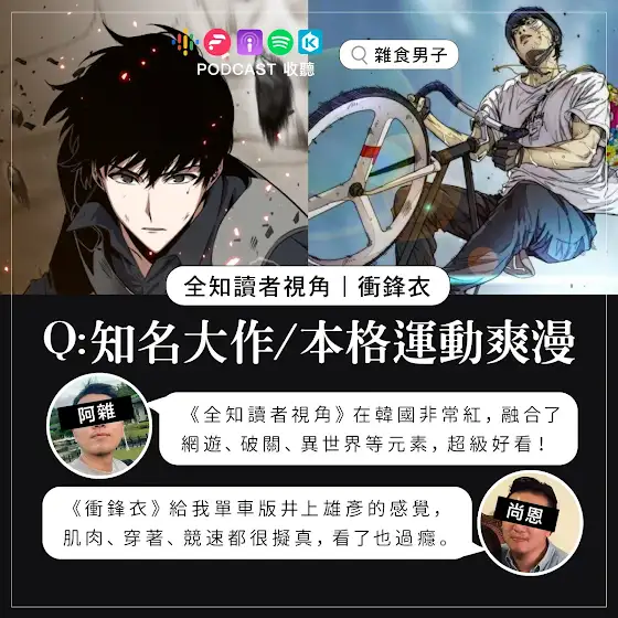 有什麼時間比新年更適合看爽漫呢?《#全知讀者視角》如果有一天奇幻小說變成現實,而你是唯一看完小說的讀者?《#衝鋒衣》極限運動就是帥!看街頭單車競速,滿足想要飆車的癮!如果你是第一次接觸「條漫」,還不知有哪些作品可以看,就來聽聽阿雜和尚恩的分享吧~--------------------聊聊條漫這玩意,有什麼值得看?更多討論請收聽 🎙 Podcast 013可在 Youtube 頻道收聽,或在平台上搜尋「雜食男子」!#webtoon #漫畫推薦 #條漫 #台灣podcast