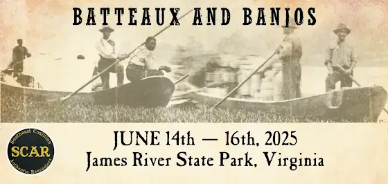 If you are interested in exploring these unique aspects of our country's heritage, join the Southeast Coalition of Authentic Reenactors (SCAR) for Batteaux & Banjos, June 14–16 2025, at beautiful James River State Park deep in the heart of the Old Dominion! Batteaux and Banjos is held the third weekend in June every year to coincide with the James River Batteau Festival, one of the country's most unique grassroots festivals, during which participants from communities along the river and beyond recreate the eight-day, 120 mile trip from Lynchburg to Maiden’s Landing near Richmond on functioning replicas of the original James River batteaux. Visitors to Batteaux and Banjos will be able to watch the batteaux up close as they pass by the park headed downriver on Monday, June 16. If you're lucky, they may even stop and let you step aboard!