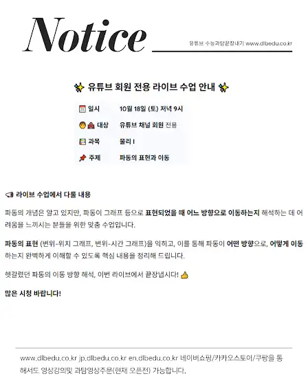 오늘 저녁 9시 회원전용 라이브 강의 물리 파동의 표현및 이동 입니다