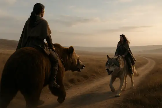 I had a dream this morning, September 14, 2025, where I was walking down a dirt path on a brown field. When I took a left, there was a woman riding a grizzly bear in front of me and moving in the same direction, I was. In the distance, i saw a woman riding a wolf approaching both me and the bear. Understandably, I was nervous that the bear would turn and attack me or that the wolf would do the same when it ultimately arrived. Of course, there was a third possibility that the bear would attack the wolf or vice versa and I would be caught in the cross-hairs. As the two animals passed each other, they growled at one another warily, but nothing ultimately happened. At some point either before or after this incident, I was in a room having a conversation with a man named Jens. I have no idea about what.