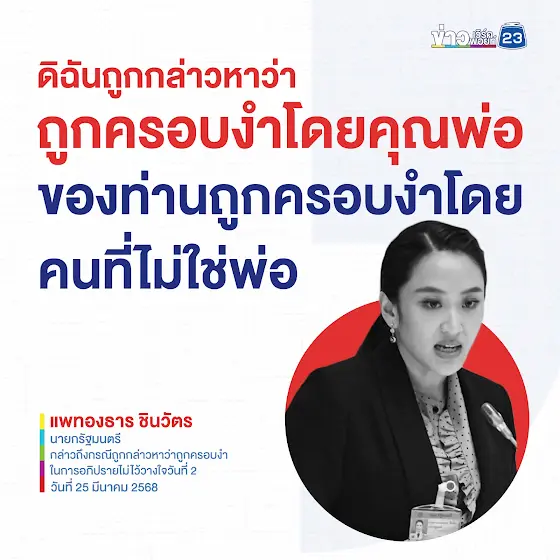 ดิฉันถูกกล่าวหาว่าถูกครอบงำโดยคุณพ่อ ของท่านถูกครอบงำโดยคนที่ไม่ใช่พ่อ แพทองธาร ชินวัตร นายกรัฐมนตรี กล่าวถึงกรณีถูกกล่าวหาว่าถูกครอบงำในการอภิปรายไม่ไว้วางใจวันที่ 2 วันที่ 25 มีนาคม 2568