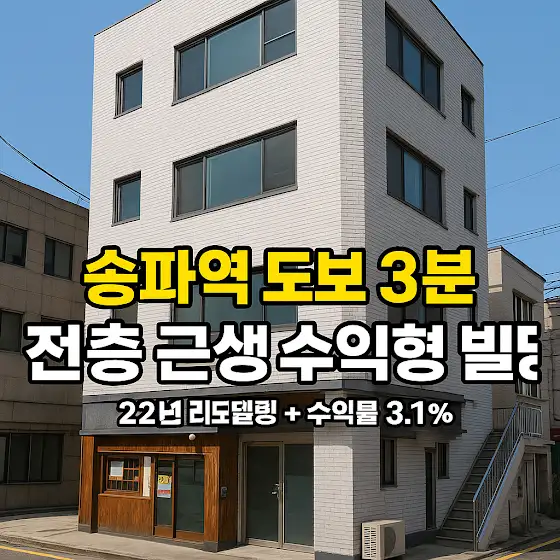 송파역 3분, 전층 근생 수익형 빌딩이번 쇼츠는 송파구 석촌동에서 소개한전층 근린생활시설 + 22년 리모델링이 완료된 수익형 꼬마빌딩입니다.✔ 송파역 8호선 도보 3분✔ 전층 근생 구성 (지하1~지상4층)✔ 월 임대수익 885만 원✔ 안정적 임대 구조(연기학원·음식점·PT샵·에스테틱 등)✔ 깔끔한 외관 + 관리 용이 구조✔ 실투 약 36억대, 수익률 약 3.1%영상은 아래에서 보실 수 있습니다.👉 youtube.com/shorts/w98M56VADvw송파역 초근접 입지 특성상,임대 대체수요가 탄탄하다는 점이 이 매물의 가장 큰 강점입니다.서울 핵심 입지 빌딩 영상은 재생목록에서 더 보실 수 있어요.👉 (https://www.youtube.com/watch?v=8EISI...)#송파역 #석촌동 #송파구빌딩 #근생건물 #전층근생 #수익형부동산 #꼬마빌딩투자 #서울상업용부동산 #빌딩매매 #부동산투자 #맥빌딩 #역세권건물 #임대수익형 #리모델링건물 #상업지분석