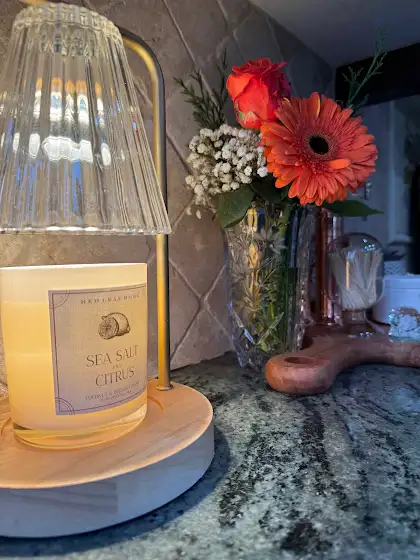 Creating cozy moments in the kitchen with fresh blooms and the calming scent of sea salt citrus.