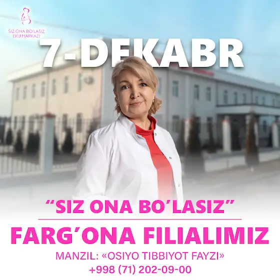 Qabul kuni: 7-dekabr Manzil: “Siz Ona Bo‘lasiz” klinikasining Farg‘ona filiali - Osiyo Tibbiyot Fayzi klinikasi Qabul vaqti: 09:00–18:00