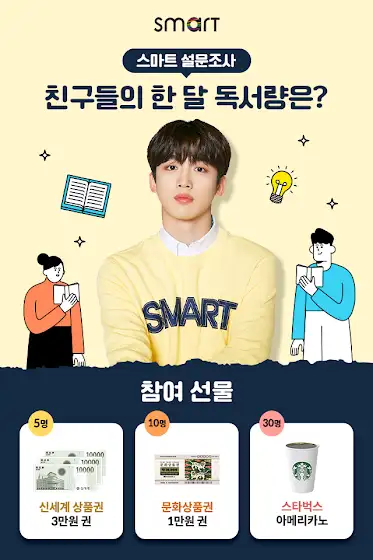 [#설문조사] 친구들은 한 달에 얼마나 많은 책을 읽어? 독서에 대한 친구들의 생각, 스마트에게 알려줘! 설문조사에 참여해 준 친구들 중 추첨을 통해 다양한 선물을 줄게! 👇설문 참여하러 가기👇 naver.me/5eG3HKaR ★경품 신세계 상품권 3만원 권(5명) 문화상품권 만원 권(10명) 스타벅스 아메리카노(30명) ★참여방법 설문조사 참여하기 ★기간 11.02(화) ~ 11.14(일) ★발표 11.17(수) -- #설문조사 #청소년설문조사 #독서 #독서설문조사 #독서량 #독서스타그램 #이벤트 #댓글이벤트 #설문이벤트