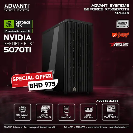 #advantisystems #advantibahrain #RTX50Series #RTX5070Ti #Ryzen79700X #AMDRyzen #PCBuild #GamingPC #CreatorPC #NextGenGaming #UltraPerformance #DDR5 #NVMeSSD #CustomPC #TechSetup #GamingRig #PCMasterRace #HighFPS #RayTracing #DLSS4 #StreamerSetup #WorkstationBuild #BahrainGamers #BuiltToDominate