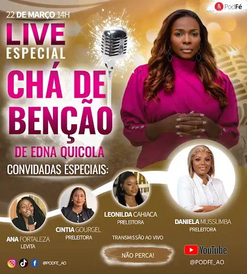 LIVE ESPECIAL – CHÁ DE BENÇÃO DE EDNA QUICOLA No dia 22 de março, o Podfé convida você para uma live especial e inesquecível em comemoração ao Chá de Benção de Edna Quicola! Para tornar este momento ainda mais especial, teremos oradoras inspiradoras compartilhando palavras de fé e sabedoria: 🔹 Profetiza Leonilda Cahiaca 🔹 Dra. Cintia Gourgel 🔹 Pastora Daniela Mussumba 🔹 Levita Ana Fortaleza Uma tarde de celebração, ensinamentos e muita emoção! Não perca! Data: 22 de março Horário: A partir das 14h Ao vivo no YouTube @podfe_ao Ative o lembrete, compartilhe e junte-se a nós nessa celebração única!
