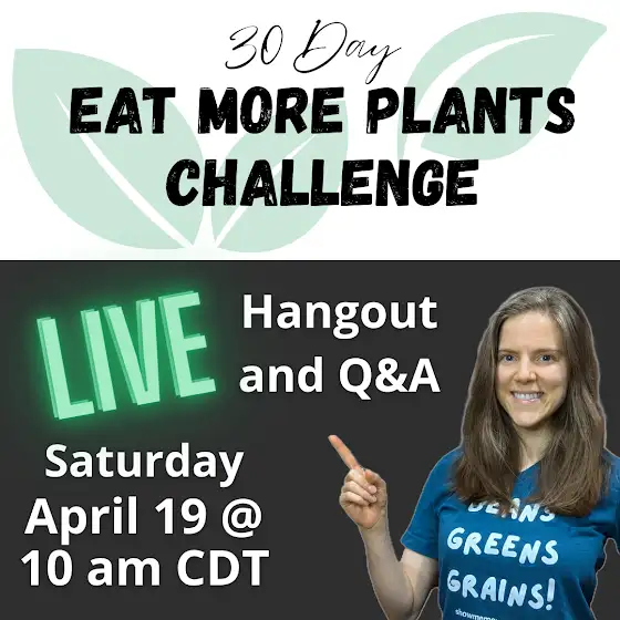 Join me this Saturday April 19th at 10am CDT for a live hangout and Q&A. You can ask me anything and we'll check in with each other on how the 30 Day Eat More Plants Challenge is going!
