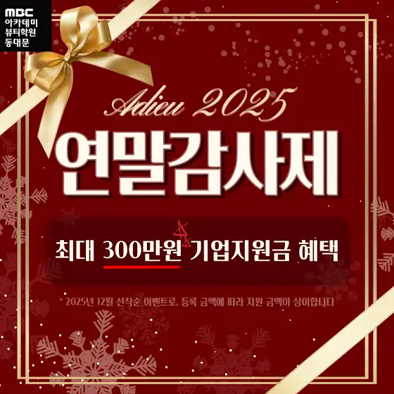 🎁 Adieu 2025MBC아카데미뷰티학원 동대문지점12월 연말 감사제 이벤트 🎄✨한 해 동안 보내주신 많은 관심과 사랑에 감사드리며,동대문지점에서 2025년 마지막 혜택을 준비했습니다!🎉 최대 300만원 기업지원금 혜택!등록 금액에 따라 지원금이 달라지는12월 한정 특별 이벤트✨✔ 선착순 진행✔ 연말 단 한 번의 혜택✔ 진로·취업·자격증 준비 학생 모두 참여 가능📅 이벤트 기간2025.12.01 ~ 선착순 마감 시까지📞 문의 : 02-6304-8888전화/카톡 상담 모두 가능!연말에만 제공되는 특별한 혜택,놓치지 마시고 새로운 시작을 준비하세요! 🎀✨🔻동대문 지점으로 컨설팅 받기🔻m.site.naver.com/1W1vn#MBC아카데미뷰티학원 #MBC뷰티 #동대문미용학원#연말감사제 #Adieu2025 #12월이벤트#미용학원추천 #미용자격증 #메이크업학원 #네일학원#헤어자격증 #피부국가자격증 #기업지원금이벤트#미용배우기 #2025년마지막이벤트 #동대문뷰티학원